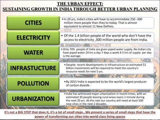 The document discusses solutions for improving urban infrastructure and sustainability in Indian cities. It notes that India's cities will need to accommodate hundreds of millions of new residents in the coming decades, putting strain on resources. It then presents several "small steps" that could be taken to transform cities, including promoting cycling and carpooling to reduce traffic, using algae lamps that absorb carbon dioxide, redeveloping slums through cooperation with residents, and generating fuel and electricity through waste management processes like algae biofuel production and sewage gasification. The document argues that while some solutions may not provide immediate results, together these measures could sustainably develop cities through better planning and resource management over the long run.