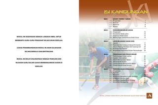 Dokumen ini adalah modul latihan sukan untuk guru penasihat kelab sukan sekolah yang bertujuan meningkatkan penyertaan dan semangat kesukanan di kalangan murid. Dasar 1Murid 1Sukan mewajibkan setiap murid untuk menyertai sekurang-kurangnya satu aktiviti sukan, dengan harapan dapat membangunkan generasi yang seimbang secara jasmani dan akademik. Modul ini juga menyediakan panduan dalam pengurusan kelab sukan dan latihan serta perkembangan kemahiran sukan dalam kalangan pelajar.