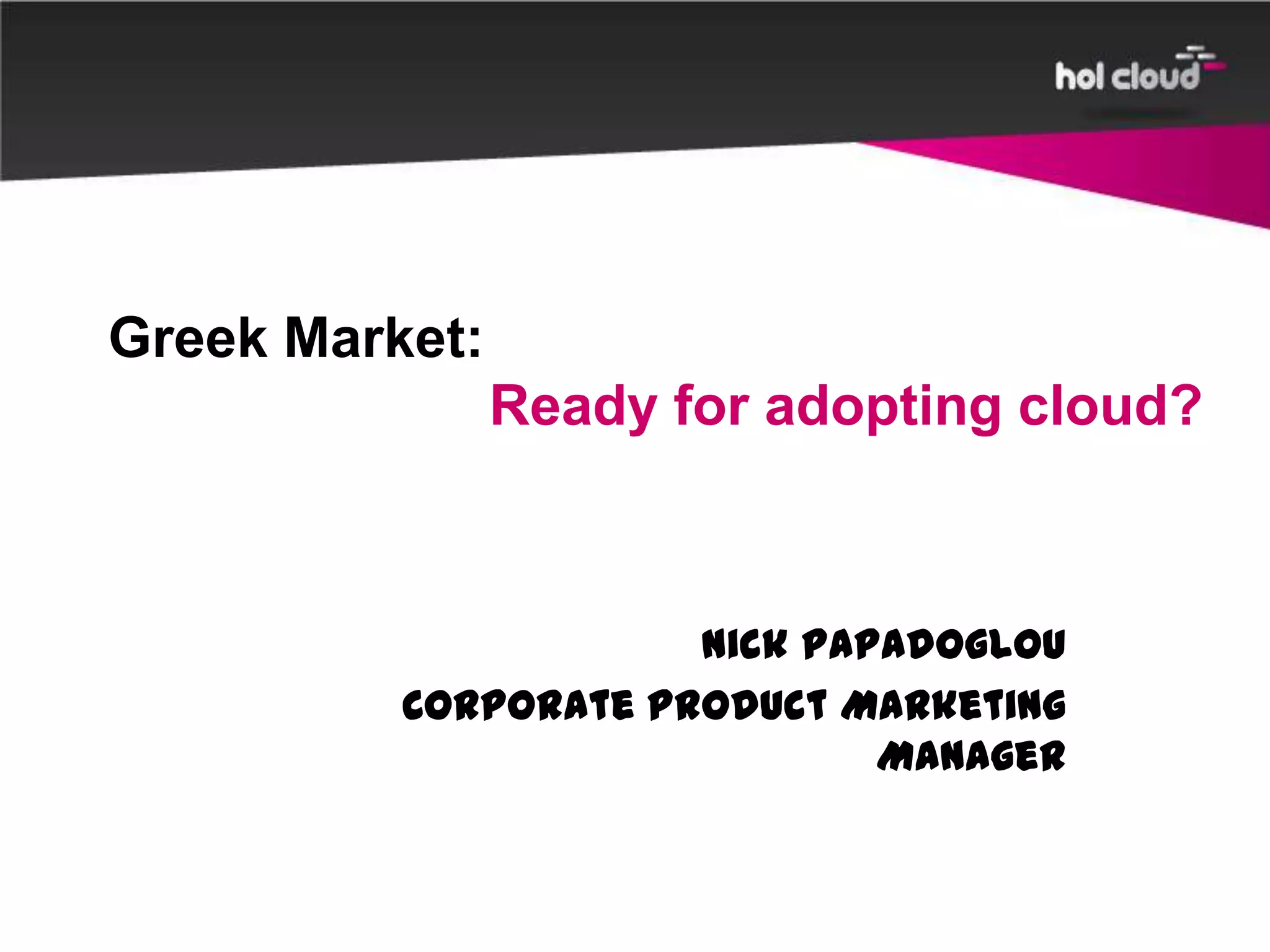 This document discusses the Greek market's readiness to adopt cloud computing and outlines a 4 pillar strategy to help businesses understand and trust cloud solutions. It acknowledges that many Greek businesses are confused about cloud options like hybrid cloud and identifies key concerns around security, costs, and when the right time is to transition. The strategy aims to break down barriers and find the right balanced cloud approach for each unique business based on their individual needs and concerns.