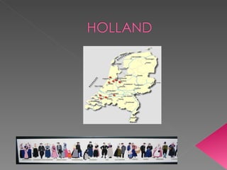Holland is a region located in the western part of the Netherlands. It has an area of 5,488 square kilometers and a population of over 6 million people. The main cities are Amsterdam, Rotterdam, and The Hague. Historically, much of the land in Holland was reclaimed from the sea through extensive drainage projects starting in the Middle Ages. Today, Holland remains a prosperous region and economic center of the Netherlands, though it faces some regional tensions due to its cultural dominance over other Dutch provinces.