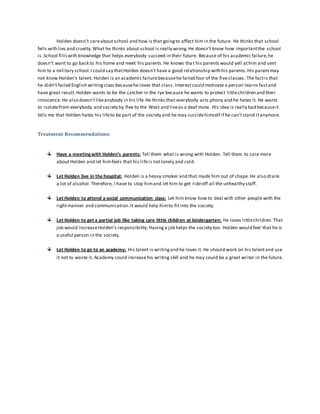 The document provides details about 17-year-old patient Holden Caulfield, noting his poor general health, careless and irresponsible behavior, immaturity, unrealistic views, self-isolation, and depression following his brother's death. It analyzes Holden's problems, including his lack of care for school, unrealistic dreams of being "the catcher in the rye," dislike of others, and desire to isolate from society, and provides treatment recommendations such as meeting with his parents, living in the hospital, attending social skills classes, and getting a job to help him develop responsibility and feel useful.