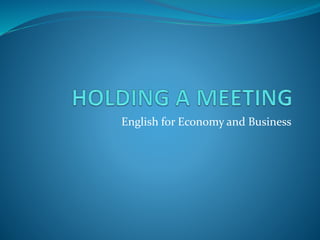 This document provides language for conducting meetings in English. It divides meetings into five parts: introductions, reviewing past business, beginning the meeting, discussing agenda items, and finishing the meeting. Phrases are given for opening the meeting, welcoming participants, stating objectives, reading past minutes, introducing the agenda, allocating roles, summarizing, setting the next meeting, and closing. Additional phrases are provided for getting attention, asking and giving opinions, agreeing, disagreeing, clarifying, and keeping the meeting on track.