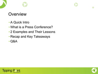 The document outlines effective strategies for conducting a press conference, detailing its purpose, examples, and key takeaways. It emphasizes preparation, location, timing, and the importance of engaging with media and stakeholders. Additional tips include the use of visuals, follow-ups, and leveraging social media for broader outreach.