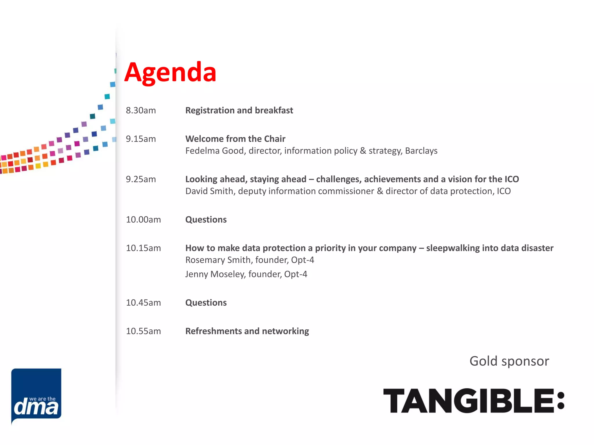 This document provides an agenda and summaries for a data protection conference on February 7, 2014. The agenda includes sessions on challenges and a vision for the UK Information Commissioner's Office, how to make data protection a priority in companies, implications of the new EU Data Protection Regulation, and stories on using big data. Speakers will discuss topics like getting board-level support for data protection, making it a business priority to avoid disasters, and opportunities under new regulations to build better customer relationships through individualized treatment and consent. The event is supported by Opt-4 as a gold sponsor and will include lunch and networking. Upcoming related training workshops and an event on customer acquisition best practices are also promoted.