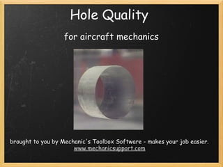 A poor quality hole will fail the aircraft joint. It does not matter how strong the rivet or bolt is if the hole is of poor quality. A poor hole can cause a loose fastener or metal fatigue and lead to joint failure at stress levels below specifications. Ensuring proper hole preparation, drilling speed and feed rate, cleaning, sizing, cold working, measuring, and plugging holes is important for maintaining optimal joint strength. The Mechanic's Toolbox software website provides tools and information to help mechanics efficiently produce quality holes.