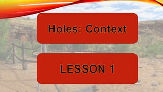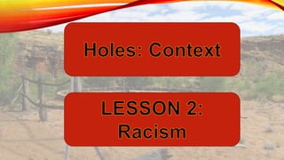 The document provides a detailed outline for understanding the context of the novel 'Holes' by Louis Sachar, focusing on various literary elements, character development, and historical context, particularly around themes of racism and justice. It includes tasks for students, such as exploring the author’s intentions, analyzing flashbacks, and discussing the juvenile justice system as it applies to the narrative. Additionally, resources like interviews and videos with the author are suggested to enhance comprehension of the text and its deeper meanings.