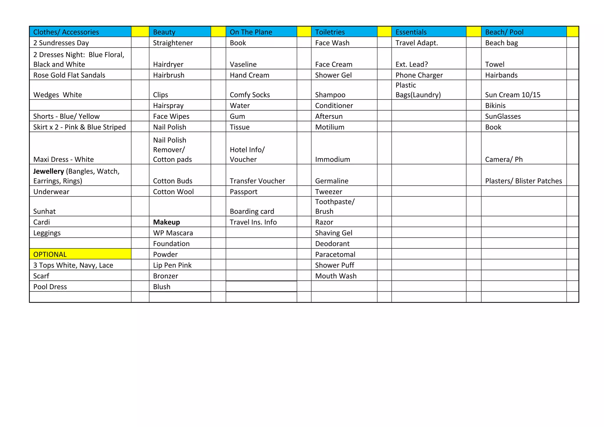 The document lists items needed for a beach vacation including clothing, accessories, beauty products, and essential toiletries. It outlines 2 sundresses, 2 dresses for nighttime, rose gold sandals, wedges, shorts, a skirt, and a maxi dress for clothing. Accessories include jewelry, a sunhat, a scarf, and a beach bag. Beauty items are a straightener, hairdryer, hairbrush, clips, hairspray, and makeup. Toiletries contain face wash, cream, shampoo, conditioner, sun cream, aftersun, tissues, gum, motilium, immodium, cotton buds, and other essential travel items.
