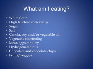 The document discusses the detrimental health effects of consuming unhealthy foods like white flour, high fructose corn syrup, and hydrogenated oils, linking them to various diseases including diabetes, heart disease, and cancer. It emphasizes the importance of choosing healthier alternatives and organic options for better health outcomes and economic savings in healthcare costs. The text advocates for a lifestyle that incorporates better dietary choices, exercise, and stress management to improve overall well-being.