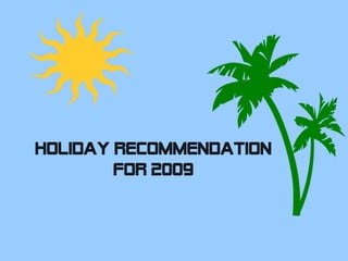 The document provides several potential holiday activity recommendations for 2009, including swimming at a new beach resort in Japan, visiting the Grand Canyon's new Skywalk, going to a theme park such as in Las Vegas, attending a tennis match in Dubai, mountain trekking, or bike riding. It concludes by wishing the recipient a wonderful holiday, whatever activities they plan to do.
