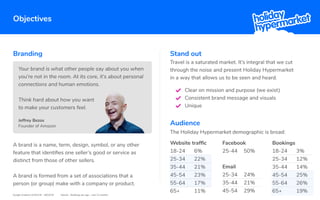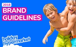 The brand guidelines document for Holiday Hypermarket outlines objectives to establish a consistent brand message and visual identity to stand out in the travel market. It provides brand pillars around saving money, time, and offering unbeatable choice. Imagery and typography styles are defined to portray the brand as approachable, bubbly and trustworthy. Slogans, logos, and social media engagement examples are included to clearly communicate the brand personality across all touchpoints.
