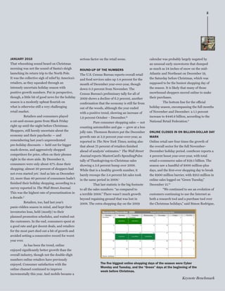 The 2009 holiday retail season showed a modest improvement, with an overall retail sales increase of 1.1% compared to the previous year, while online sales continued to outpace traditional retail growth. Despite struggles with consumer sentiment and a challenging economy, retailers adapted by emphasizing online shopping and mobile commerce, which is expected to gain significant traction in 2010. Key trends included a shift to mobile applications for a better shopping experience and a continuation of heavy discounting by consumers seeking value.