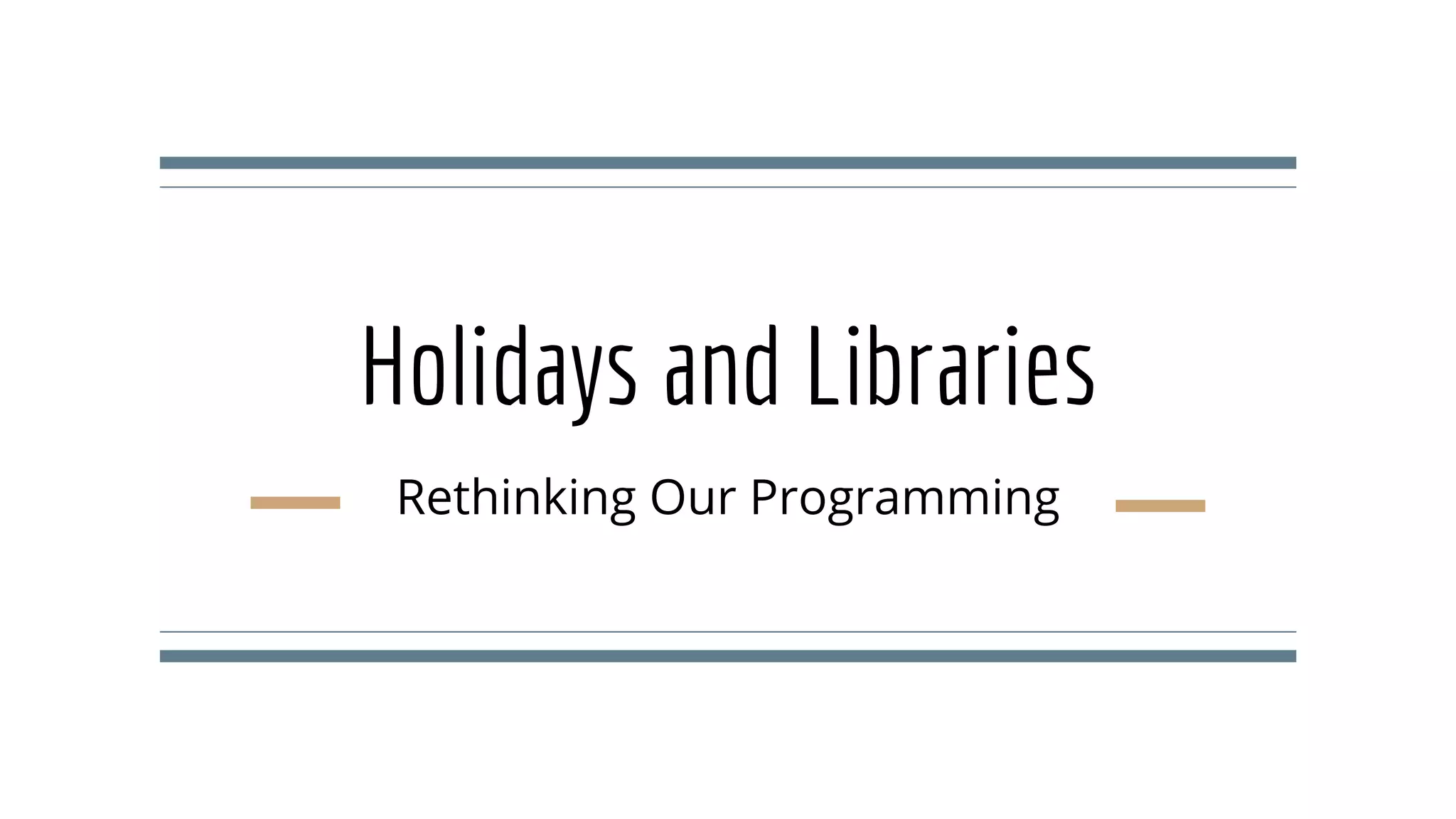 This document discusses rethinking holiday programming at libraries to be more inclusive. It notes that some children may not celebrate holidays due to factors like faith, poverty, or trauma. The document advocates making libraries welcoming for all by offering non-holiday alternatives during celebrations. It acknowledges concerns about complaints or stopping points, but argues libraries should strive to include marginalized groups as much as possible. Contact information is provided for those interested in further discussion.