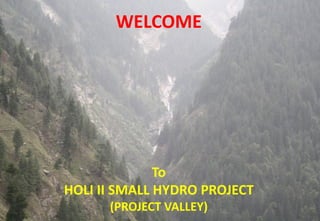 This document provides an overview of the Holi-II Small Hydro Project located in Chamba, Himachal Pradesh, India. Key details include a 7 MW installed capacity, total project land of 4.1595 hectares, design discharge of 2.7 cumecs, and net head of 313 meters. Major components include a trench weir, feeder channel, desilting tank, penstock, and surface power house with two 3.5 MW Pelton turbines. Required approvals have been received and the project is ready for construction, with 100% of the land costs paid and a 40-year land lease sanctioned.