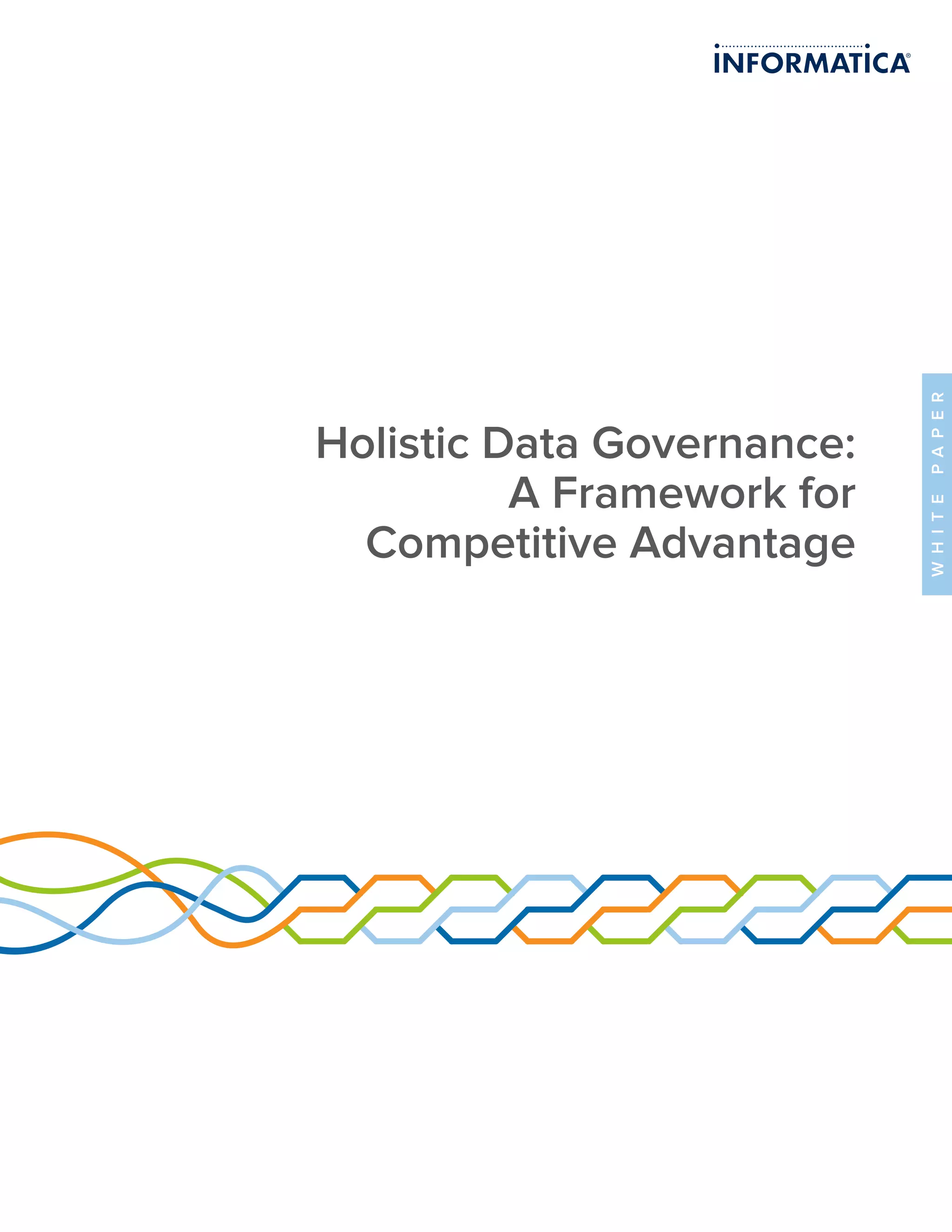 This whitepaper discusses holistic data governance and provides a framework for organizations to establish effective data governance. It argues that data governance should be treated as a core business function, rather than an IT project, in order to optimize value from data assets. The framework outlines 10 facets of data governance, including vision/business case, people, tools/architecture, policies, organizational alignment, measurement, change management, dependent processes, program management and defined processes. It also defines levels of data governance maturity from initial/ad hoc to optimized/function in order to help organizations assess their current state and develop a roadmap.