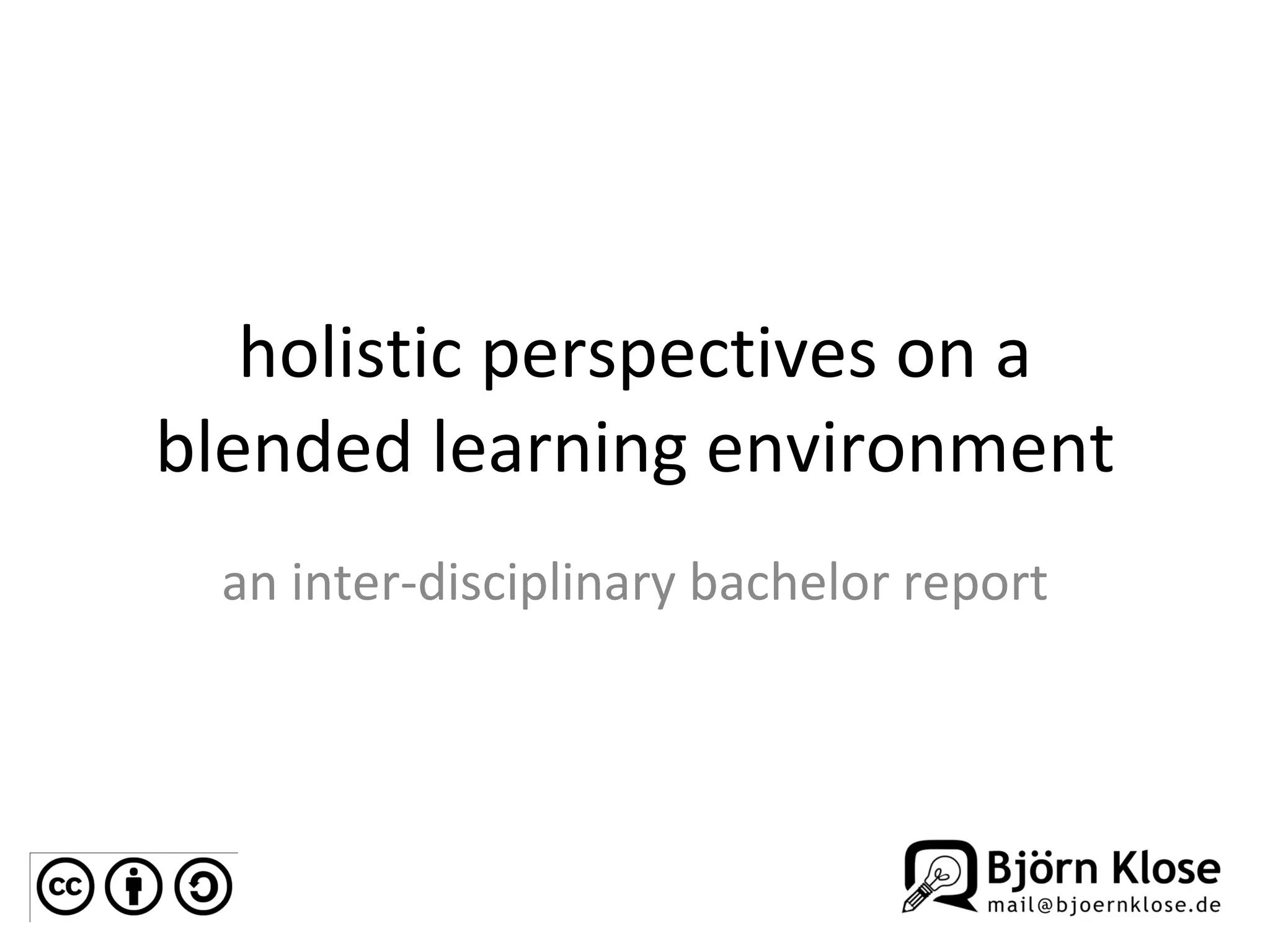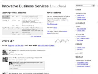 This document discusses the integration of blended learning methodologies, emphasizing the importance of technology and individual roles in a learning environment. It explores varying approaches to education, highlighting the need for collaboration, creativity, and adaptability in learning strategies. The key takeaway is that innovative business services and learning experiences can be enhanced through technology, collaboration, and the curation of knowledge.