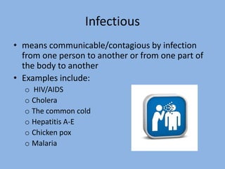 This document discusses the concepts of infectious diseases, non-infectious diseases, illness, and disease. It defines infectious diseases as those that can be transmitted between individuals, while non-infectious diseases develop from internal factors. A disease is an abnormal condition that affects an organism, while an illness refers to the feelings and symptoms a person experiences. Maintaining health involves keeping skin intact and immune system strong.