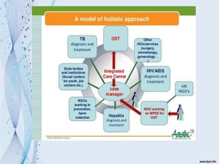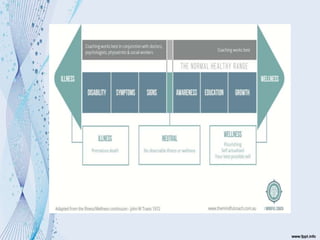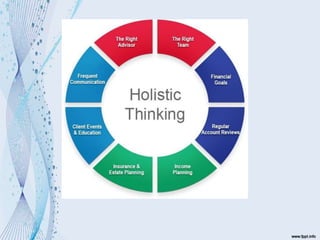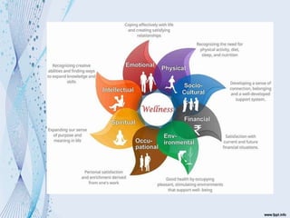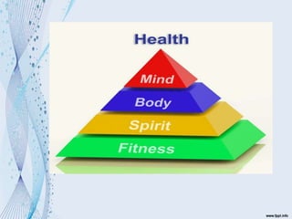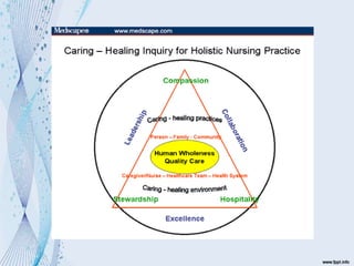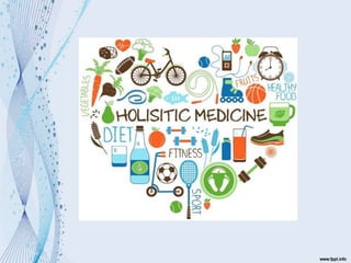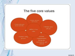 This document discusses holistic nursing and health. It defines holistic health as viewing physical, intellectual, sociocultural, psychological, and spiritual aspects of a person as an integrated whole. The goal of holistic nursing is to enhance healing of the whole person from birth to death. Holistic nursing focuses on health promotion, assisting healing, and preventing suffering by considering a patient's physical, emotional, social, economic, and spiritual needs. It uses both conventional and complementary approaches. Core values of holistic care include considering patients as experts in their own health and respecting their subjective experiences while recognizing each person's uniqueness. Dimensions of holistic health care discussed are nutritional awareness, physical fitness, stress management, and environmental sensitivity.