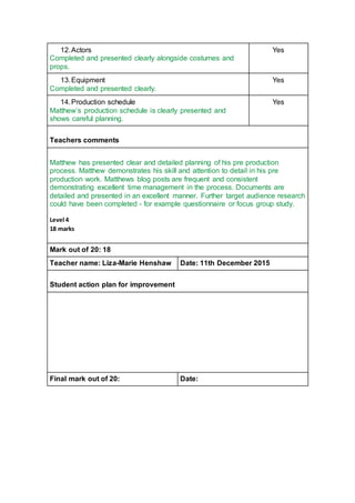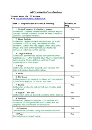 Matthew completed thorough research on similar film openings and his chosen genre. He analyzed mise-en-scene and considered how this research could influence his own film opening. Matthew demonstrated detailed consideration of his target audience but could have done further research through questionnaires. He produced an excellent script, storyboard, shotlist, floor plans, photographs of locations with risk assessments, costumes, props, and actors. Matthew also presented clear equipment and production schedules, showing careful planning. His teacher commended his detailed pre-production work but noted further target audience research was needed.