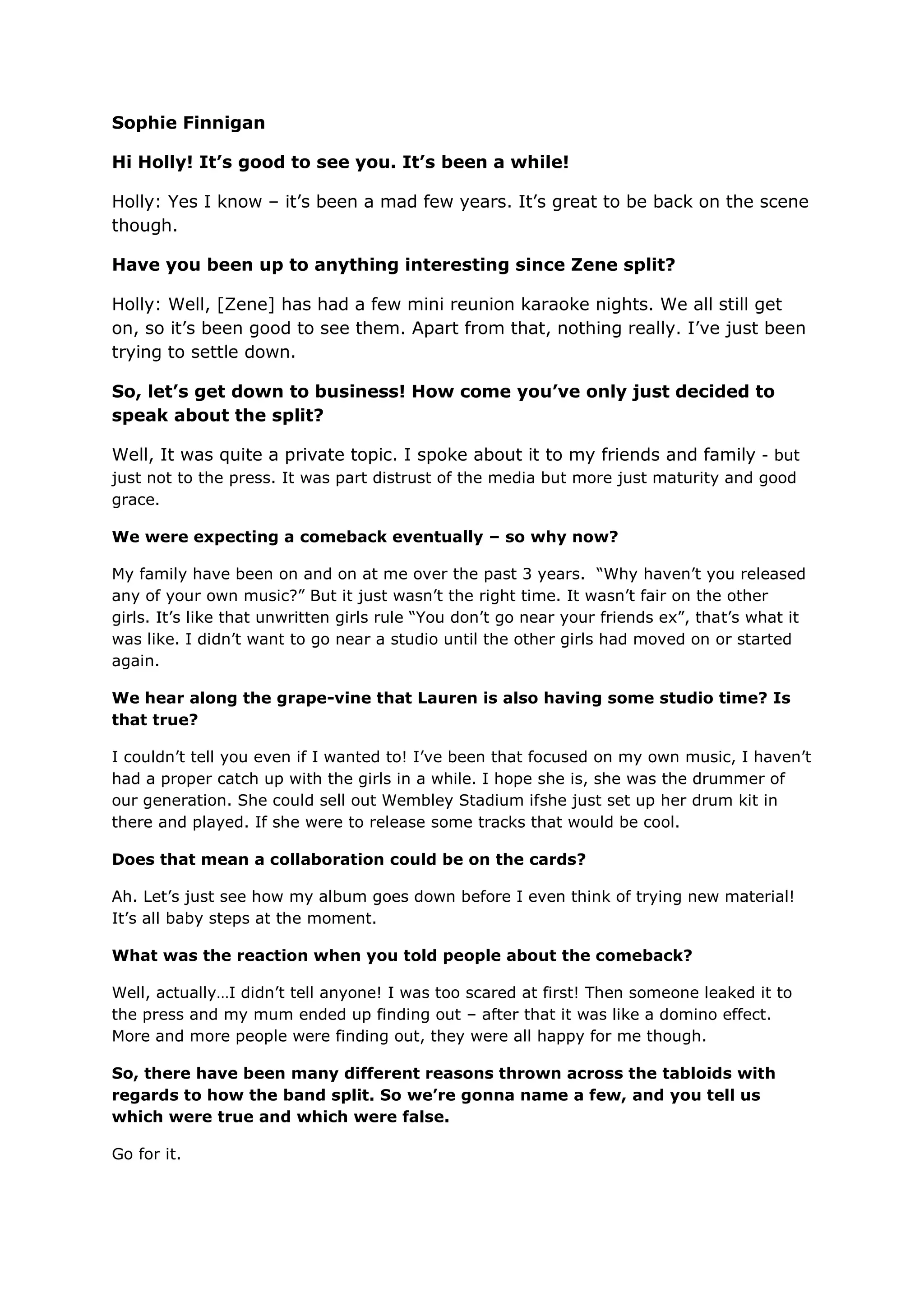 - Holly was a member of the popular girl group Zene, which split up a few years ago. She has now decided to speak publicly about the split and release her own solo music.