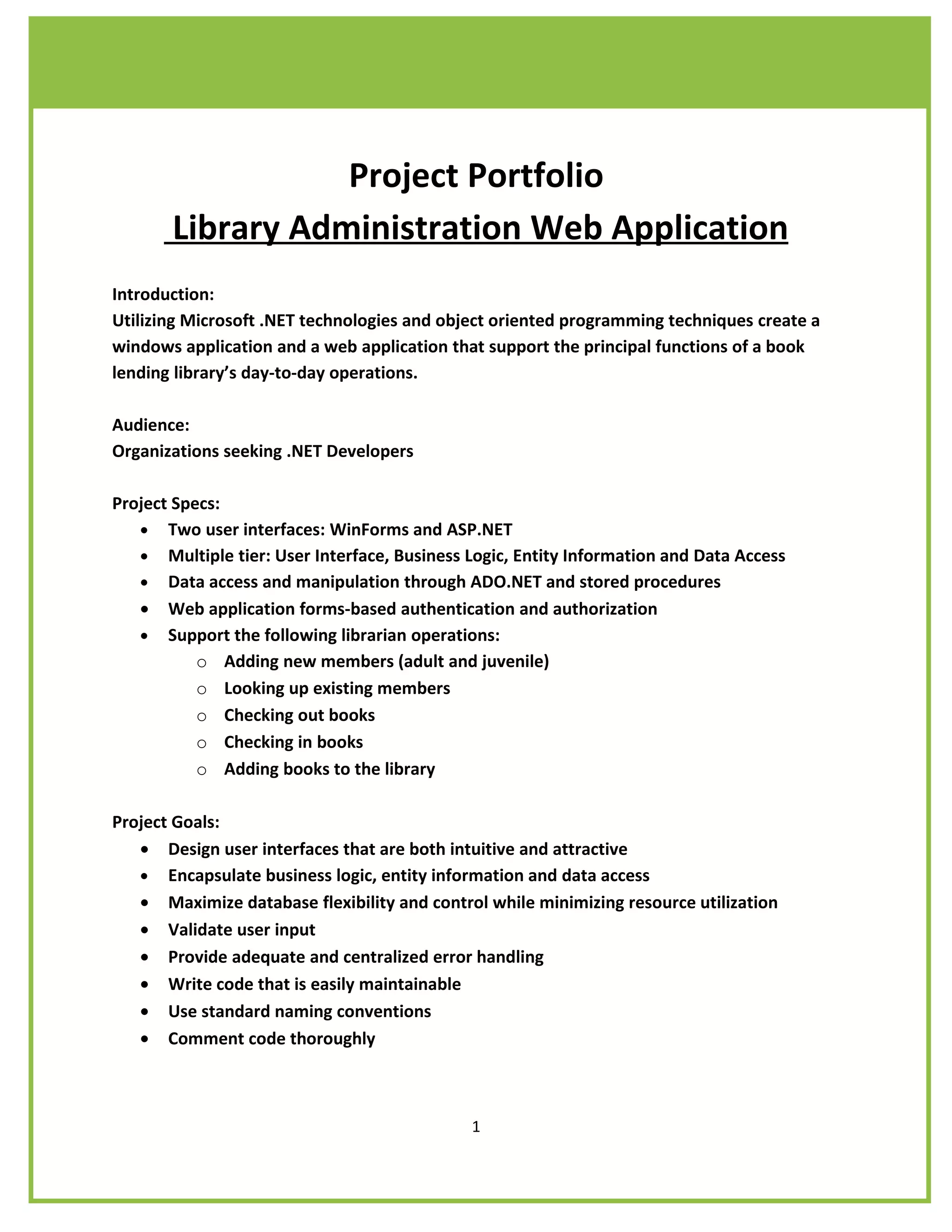 The document describes the design and implementation of a library management system with both a Windows Forms and ASP.NET web application, including user interfaces to add members, books, check items in and out, and backend classes for business logic and data access with a SQL Server database using stored procedures. It provides code snippets and screenshots illustrating the user interface, validation, class structure and data flow between the different tiers when adding an adult member.