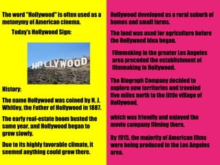 The Hollywood sign originated from a real estate development called Hollywood in the late 1880s. Over time, the area developed into the center of the American film industry due to its favorable climate. By the early 1900s, major film studios like Paramount, Warner Bros., RKO, and Columbia had set up production facilities in Hollywood, cementing its status as the capital of American cinema. Today, major film studios like Universal, Disney, Fox, and DreamWorks continue to operate in Hollywood and produce many well-known films.