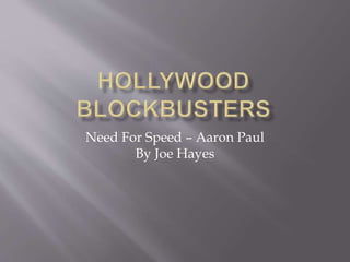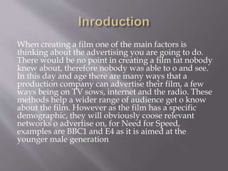The document discusses advertising strategies for the film Need for Speed starring Aaron Paul. It describes how the film was promoted on relevant TV networks like BBC1 and E4 given its target demographic of young males. Promotions also included Aaron Paul appearing on the TV chat show Top Gear to describe the film given the show's similar audience. Additionally, clips of Aaron Paul's appearance at the E3 gaming convention were shared widely online through YouTube, Facebook, and Twitter to reach more potential viewers. Casting Aaron Paul, known for his role in Breaking Bad, was a good choice to attract a wider audience and boost advertising by having him make appearances on other popular shows.