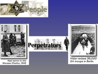 The Holocaust was the systematic persecution and murder of approximately six million Jews by the Nazi regime and its allies and collaborators. Between 1933-1945, Jews were segregated into ghettos, deported to concentration and extermination camps, and murdered en masse. In total, the Nazis established over 300 ghettos and camps across Europe where Jews and other victims lived in inhumane conditions before being transported to death camps to be killed in gas chambers or by other means. By 1945, around 90% of Europe's Jewish population had been killed under the Nazi "Final Solution" plan.