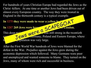 The document discusses the history of anti-Semitism, highlighting its origins and the treatment of Jews in Europe, particularly during the Holocaust. It illustrates the societal scapegoating of Jews, which intensified after World War I and during the economic depression, leading to the horrific murders of six million Jews by the Nazis between 1939 and 1945. Personal accounts and grim details about concentration camps, executions, and the mass extermination of Jews are included to emphasize the scale and brutality of these events.