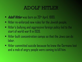 1) Adolf Hitler, who ruled Germany from 1933 to 1945, established racist policies that oppressed Jews and led to their imprisonment and murder in concentration camps.