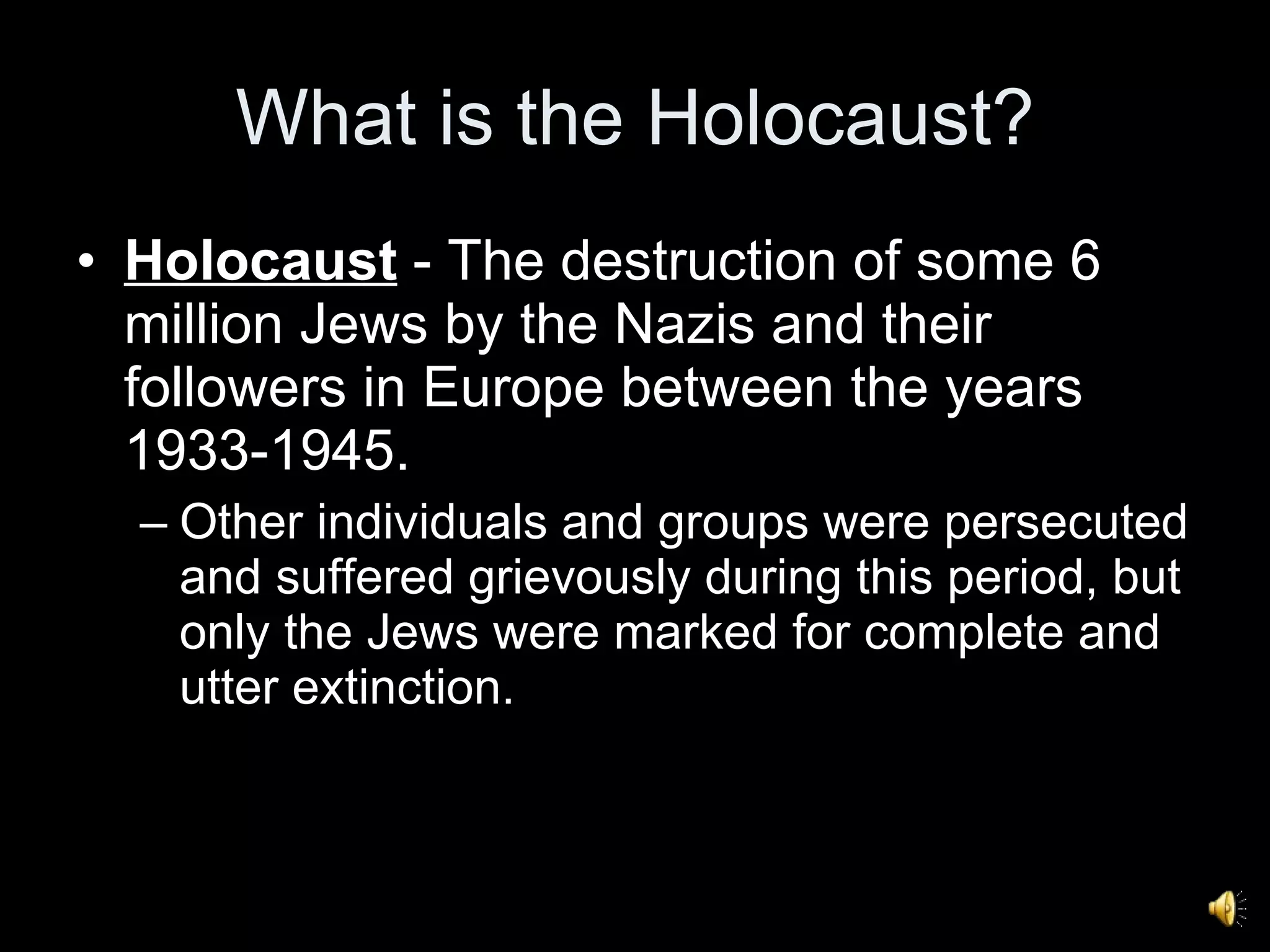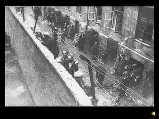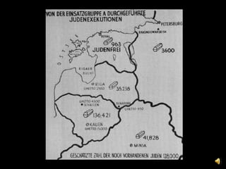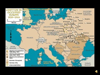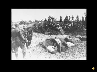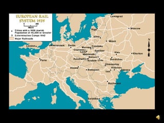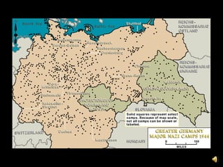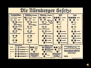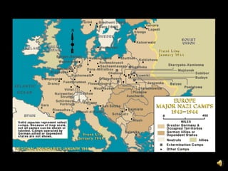 The document provides an overview of the Holocaust that took place from 1933 to 1945. It describes how the Nazis targeted around 6 million Jewish people for extermination through a systematic process that started with discrimination and deprivation of rights, then isolation in ghettos and deportation to concentration and death camps, where people were killed in gas chambers and their bodies cremated. Key elements that led to the Holocaust included totalitarianism, German nationalism, a history of antisemitism, and Hitler's belief in racial supremacy of Aryans over Jews and other groups.