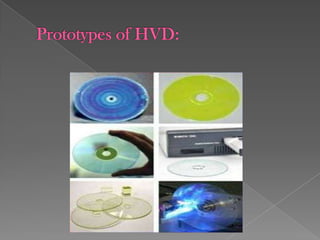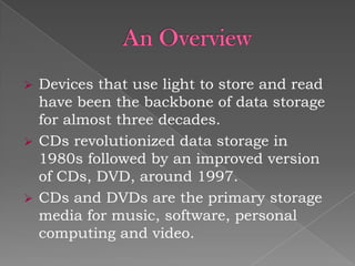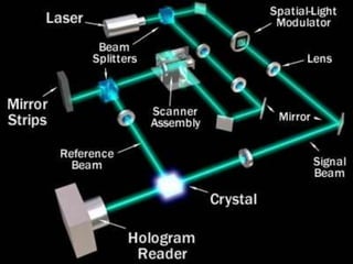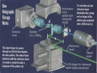 The document discusses the evolution of data storage from CDs and DVDs to the emerging technology of holographic memory. Holographic storage can hold significantly more data in a small volume, using holograms created by split laser beams to store information as interference patterns. Although promising with potential for high data density and speed, holographic memory is still in development, facing challenges in recording materials and technology readiness for commercial use.