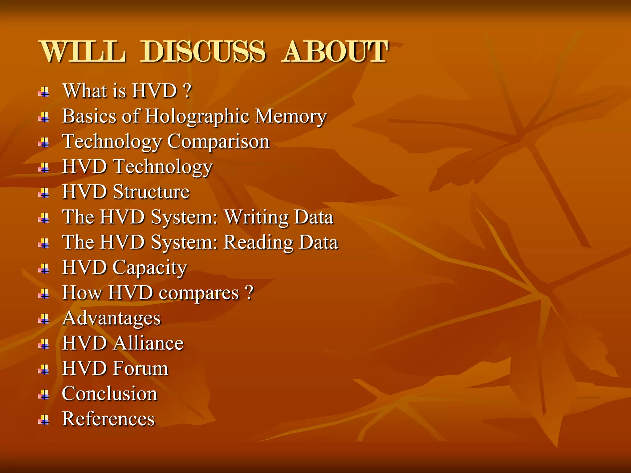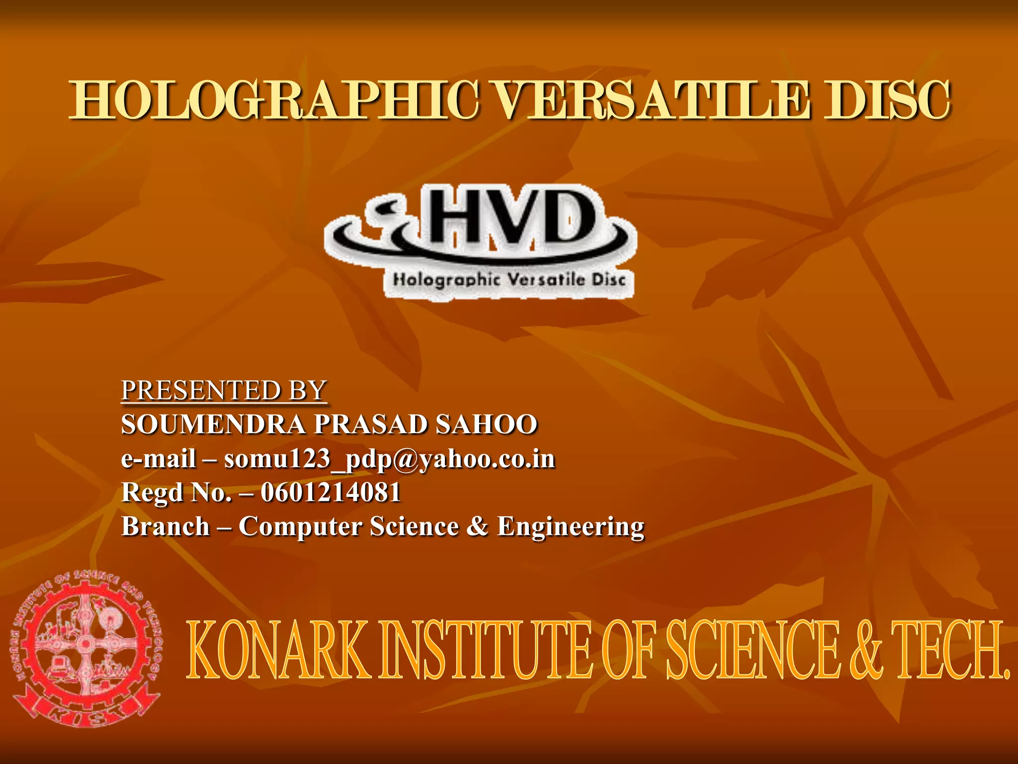 The document discusses the Holographic Versatile Disc (HVD), a next generation optical disc format that can store up to 3.9 terabytes of data. HVD uses holographic memory techniques to record information by using the interference patterns of laser light. It has a high storage capacity and fast data transfer rate compared to existing formats like DVDs. The HVD format is supported by many technology companies and movie studios as the successor to DVDs for high definition video and audio storage.