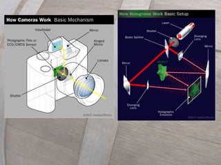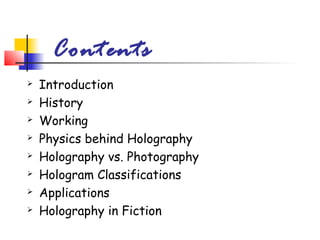 This document provides an overview of hologram technology. It discusses the history of holography, how holograms work using interference patterns recorded by lasers, and different types of holograms like transmission, reflection, and volume holograms. The document also covers applications of holograms such as data storage, art, security, sensors, and holographic displays. Holograms allow three-dimensional images to be reconstructed from a two-dimensional surface.