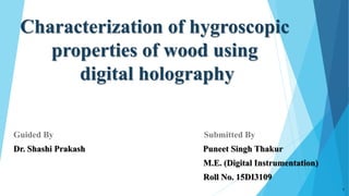 This document provides an overview of using digital holography to characterize the hygroscopic properties of wood. It discusses the basic principles of digital holography, the experimental setup used, and the methodology. The methodology involves recording holograms of wood samples as they dry, numerically reconstructing the holograms, and using phase detection algorithms to calculate strain and determine the hygroscopic shrinkage coefficient from changes in the wood's moisture content. Next steps include working on algorithms to unwrap phases from holograms and correlate phase changes with deformation measurements.