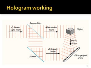 This document provides an overview of holography, including its history, properties, construction, uses, and advantages/disadvantages. It explains that holography was invented in 1948 and allows images to be recorded in three dimensions using interference of laser light. A hologram can reconstruct the original scene from any angle, providing depth perception. Common applications of holography include security features on identity cards and packaging due to the difficulty of duplicating holograms. While holograms have benefits for authentication, they also have disadvantages like requiring a direct light source to be visible and not being very bright.