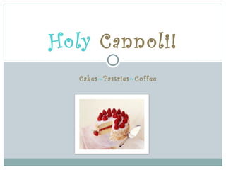 This flyer advertises a bakery called Holy Cannoli that sells cakes, pastries, coffee and other sweet treats like cream filled pastries and scrumptious desserts, encouraging people to visit and indulge their sweet tooth.