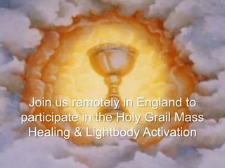 This document advertises a remote event in England to connect with ancient Celtic and Druidic teachings. Participants will hear a Merlin prophecy about coming changes and attune to energy lines and grids across sacred English sites. Through meditation, they will receive frequencies from celestial bodies and systems to awaken Christ consciousness and connect with the Goddess and holy grail energies for healing and lightbody activation.
