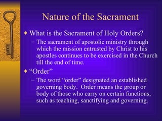 The Sacrament of Holy Orders continues Christ's mission through the Apostles by establishing an ordained priesthood to lead the Church. There are three degrees of Holy Orders - bishops, priests, and deacons - with bishops and priests able to celebrate the sacraments. At ordination, candidates undergo examination, promise obedience, receive the laying on of hands by the bishop, and anointing with chrism as a sign of their consecration to serve God's people by preaching, administering sacraments, and building up the Church.