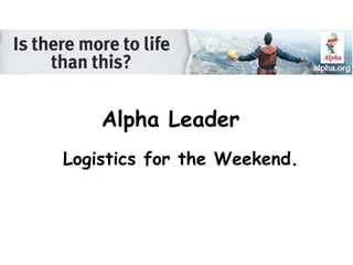 This document provides guidance and logistical information for leaders involved in an Alpha weekend away and healing service. It discusses personal preparation through fasting, prayer and reading scripture. It offers tips for prayer ministry including praying in pairs by gender, giving guests an "out" to decline prayer, and encouraging them after prayer. The document emphasizes allowing the Holy Spirit to lead and keeping prayers simple. It explains words of knowledge and different forms healing can take. Leaders are encouraged to covenant to pray for each other regarding their challenges.