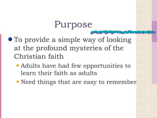 The document provides an overview of the St. John Fisher Lenten Mission taking place on April 5-6, 2006 in Richmond, Texas. It discusses the purpose of providing a simple way to understand profound Christian mysteries and relate familiar elements of faith like liturgy and sacraments to God's works. It then summarizes the plan to examine Holy Thursday, Good Friday, Easter Sunday and Pentecost, relating them to God's works of Creation, Redemption, Sanctification and Glorification.