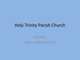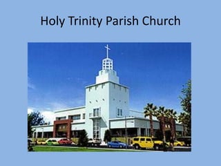 Holy Trinity Parish Church was founded on November 29, 2002 and is located in Cainta, Philippines. It serves several surrounding areas and has a main church along the main road of Village East Executive Homes in Cainta as well as chapels in smaller communities. The parish's vision is to be a community of God's unconditional love and bring others to faith, and its mission is to be a Catholic community centered on spreading God's love through actions and examples of true Catholicism.