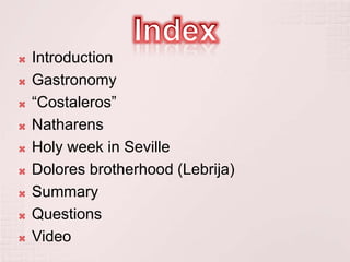 The document discusses Holy Week traditions in Spain. It describes the religious celebrations and processions that take place during Holy Week, carried out by religious brotherhoods. Specific traditions mentioned include penitents accompanying ornate floats called pasos, sweets eaten during Holy Week, and different roles for people carrying the pasos known as costaleros. The most famous Holy Week processions are described as taking place in Seville, with over 60 brotherhoods participating.