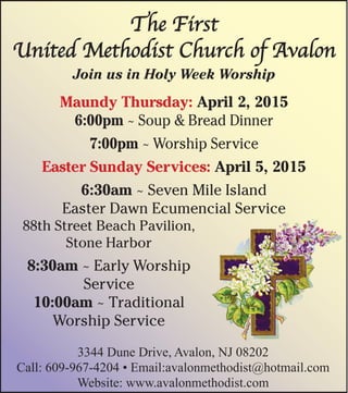 The document contains announcements for various church services and events happening during Holy Week and Easter Sunday across multiple churches in Cape May County, New Jersey. The churches are providing services like Palm Sunday masses, Good Friday worship, Easter Vigils, sunrise services and traditional Easter Sunday celebrations between March 29th and April 5th, 2015.