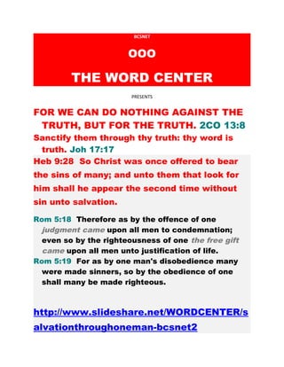 The document emphasizes the significance of truth as articulated in various biblical verses, stressing that believers can do nothing against the truth but should uphold it. It highlights the themes of salvation through Christ's obedience and the importance of faith and righteousness in the relationship between God and humanity. The text also warns against relying on worldly wisdom, urging unity and shared understanding among believers in Christ.