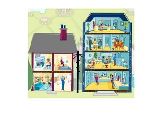 This document describes various rooms in a house and objects within each room. It provides sentences with information about objects located in different rooms like the bedroom, bathroom, kitchen, and living room. It also includes sentences with possessive pronouns and activities like listening and writing exercises related to objects in the house.