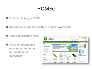 Homee is an international company founded in 2008 that focuses on making home automation accessible to everyone, utilizing Z-Wave technology for interoperability. The document discusses various applications of home automation, including energy savings, security, and multimedia control, highlighting that an average home can be automated for around $4000. It emphasizes the benefits of automation versus simple control, alongside customer concerns about product compatibility and design.