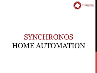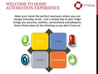 The document outlines the features and benefits of a smart home automation system offered by Synchronos, emphasizing security, comfort, and convenience. Key functionalities include visitor management, intrusion detection, environmental controls, and integrated audio/video management, all accessible via touch panels and remote control. The system allows users to create customized scenes for various home settings to enhance their living experience.