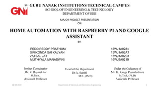 The document describes a home automation project using a Raspberry Pi and Google Assistant. The project allows users to control home appliances like lights, fans, air conditioners and water pumps using voice commands to the Google Assistant. It provides details on the components used like the Raspberry Pi, relays, motor drivers. The working involves giving voice commands to Google Assistant which are sent to IFTTT and then to a cloud server connected to the Raspberry Pi to control the appliances. The program and circuit details are also explained along with advantages like convenience, customization and security and disadvantages like learning curve and reliability issues. Potential applications and future scope are discussed.