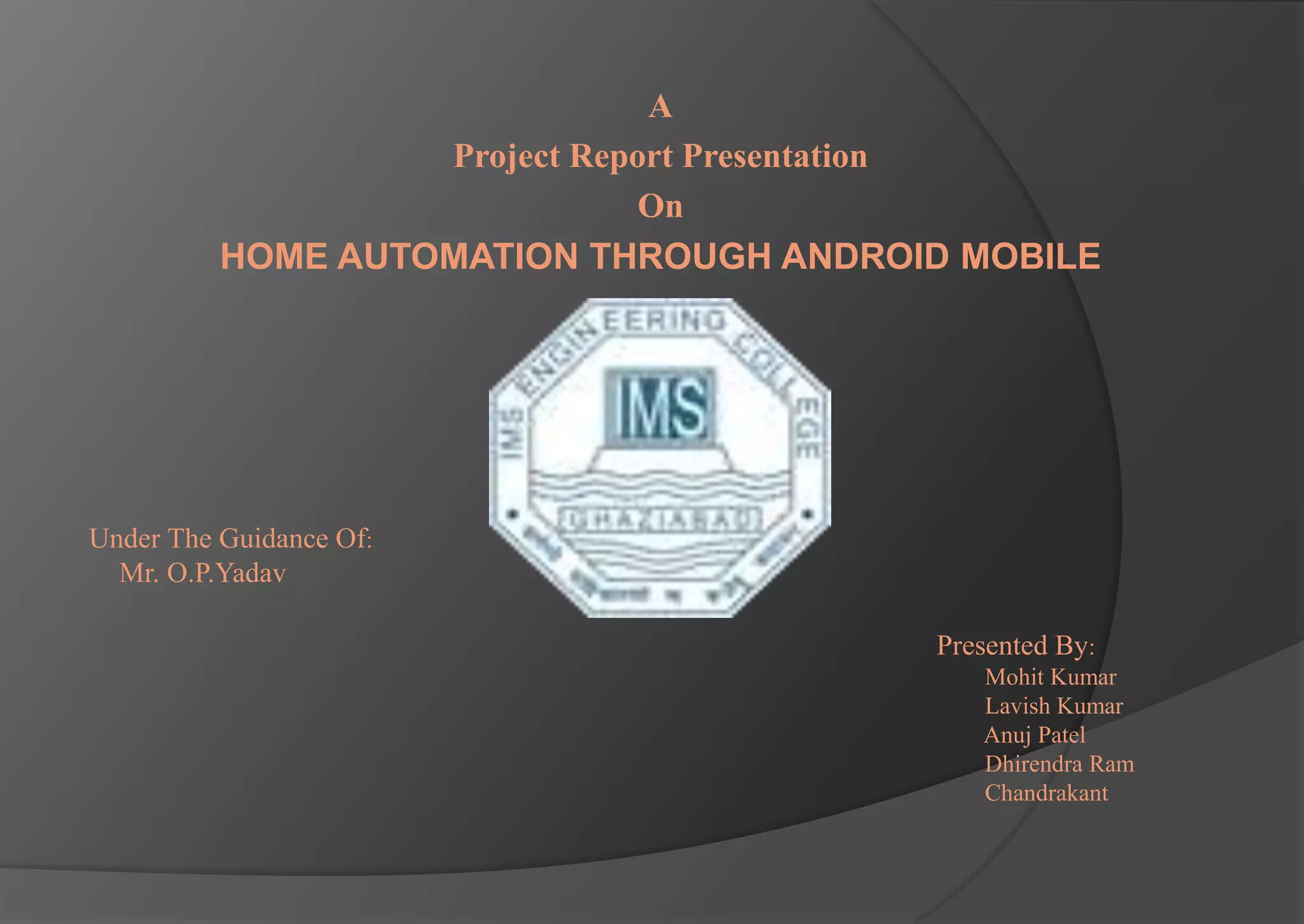 This project report presentation summarizes a home automation system developed using an Android mobile phone. The system allows remote control of home appliances like lights and fans using a Bluetooth-enabled Android phone as the central controller. The key components include an Android phone, microcontroller, Bluetooth module, relays, and household devices. The Android phone sends commands to the microcontroller via Bluetooth. The microcontroller then operates the relays to control the connected devices. This allows remote monitoring and control of home appliances through a mobile app for convenience. The system aims to provide a low-cost solution for smart home automation using widely available Android and Bluetooth technology.