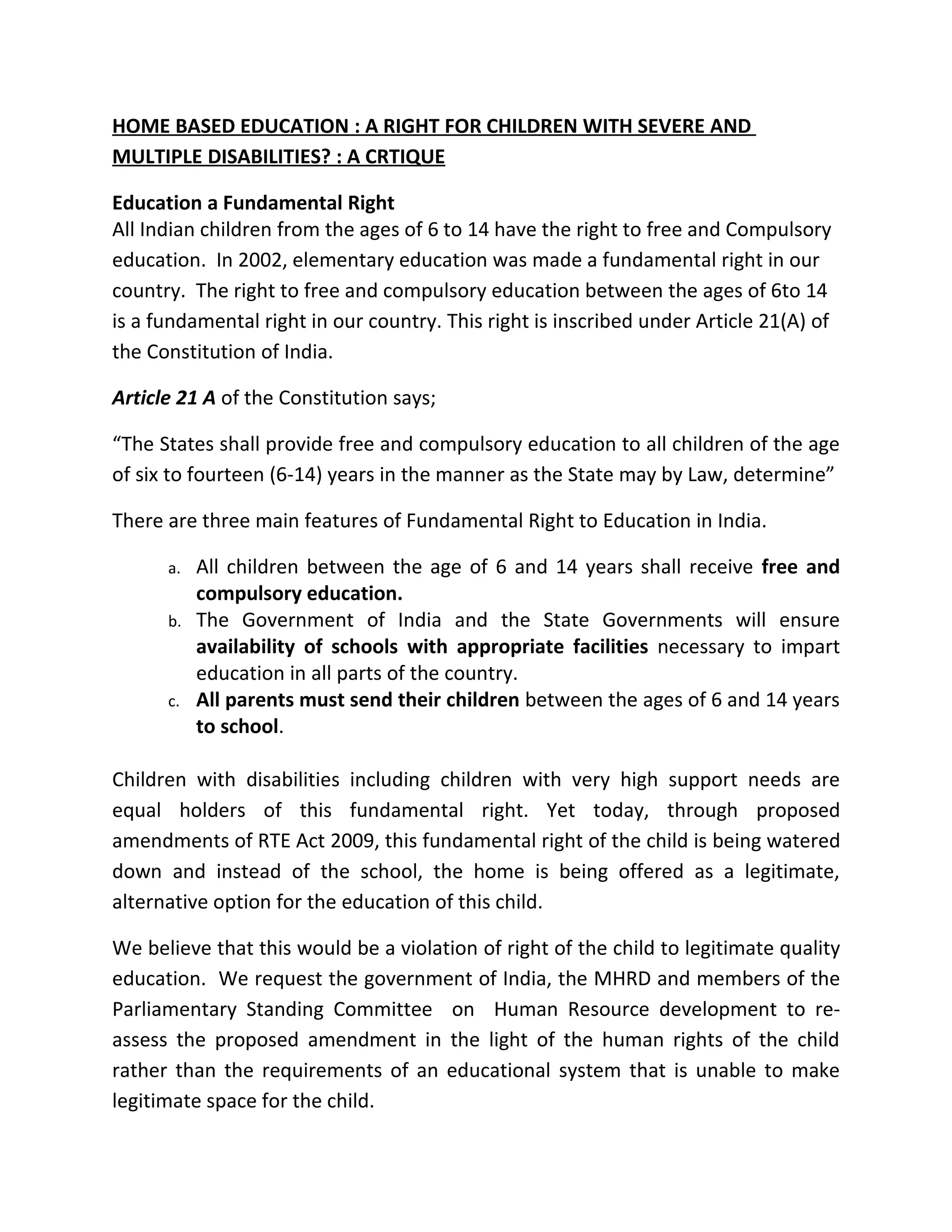 1. The document discusses a proposed amendment to the Right of Children to Free and Compulsory Education Act 2009 in India that would make home-based education a legal option for children with severe and multiple disabilities.